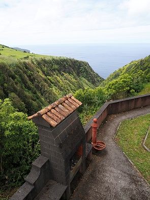 Der Aussichtspunkt selbst ist ruhig gelegen, mit Parkmöglichkeiten in der Nähe. Ein kleines Plateau mit Geländer bietet ausreichend Platz, um sicher zu fotografieren und die Landschaft in Ruhe zu genießen. Die hier verbauten lavasteine haben viele vom Regenwasser ausgewaschene kleine, runde Löcher und Echsen huschen darauf herum. Wer möchte, kann hier natürlich – wie überall auf den Azoreninseln – auch grillen und picknicken.
