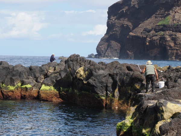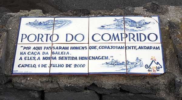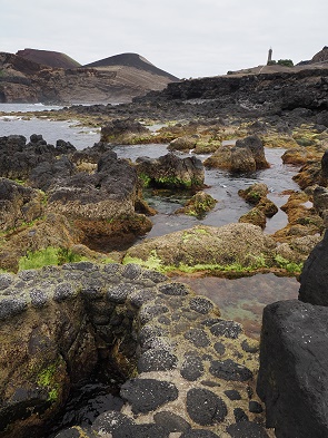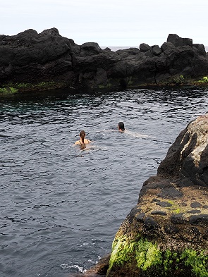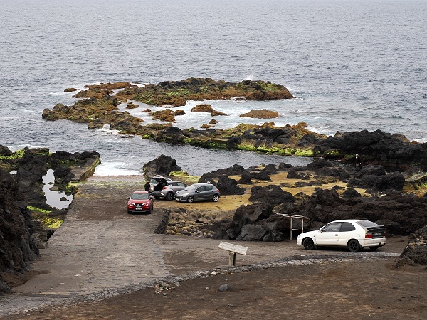 Heute ist Porto do Comprido ein ruhiger Ort, beliebt bei Spaziergängern und als Ausgangspunkt, um die vulkanische Küste zu erkunden. Auf den Plattformen kommt man gut ins Meer, daher ist das hier auch ein beliebter Badeplatz. Zwei Frauen kamen zum Schwimmen, uns hat es hier nicht ins Wasser gezogen. Zum einen war es uns dafür zu frisch, zum anderen trieben hier in der Nachbarbucht nur einige Meter entfernt mehere Portugiesische Galeeren (Physalia physalis).
