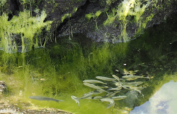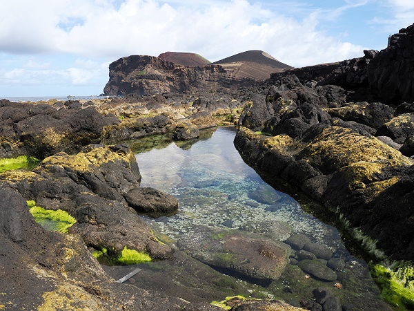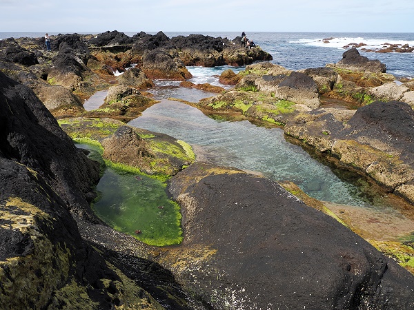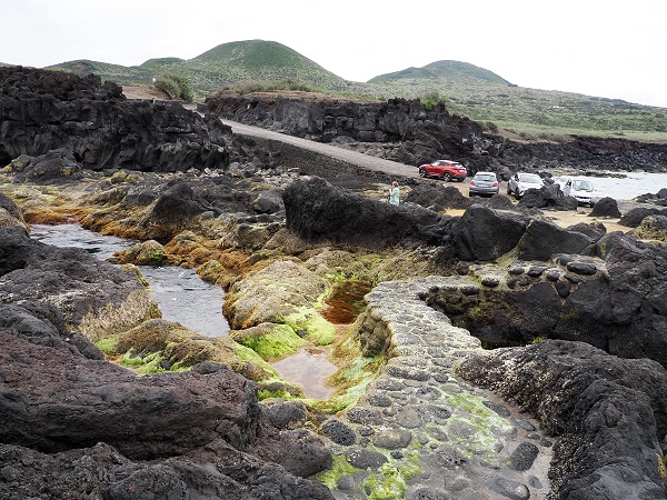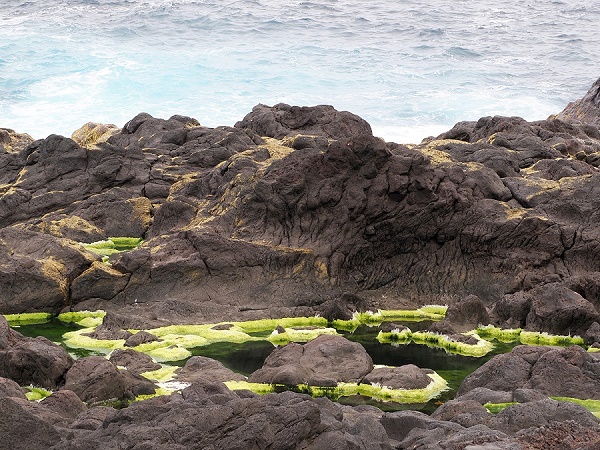 Bei recht ruhiger See kann man hier im Hafen noch die Strukturen der alten Basaltfelsen sehen, teils mit Meeresbecken, die wie kleine Naturpools wirken und rundum von fadenförmigen Grünalgen umgeben sind. Im Wasser erscheinen sie leuchtend grün durch das Chlorophyll. Wenn sie trockenfallen, sterben oder inaktiv werden, zerfallen die Chloroplasten. Übrig bleibt hauptsächlich die farblose Zellulosewand, was die Alge dann blassgelb bis weiß aussehen lässt, so ergibt sich an der Wasserkante eine fotogene weiß-grüne Linie.