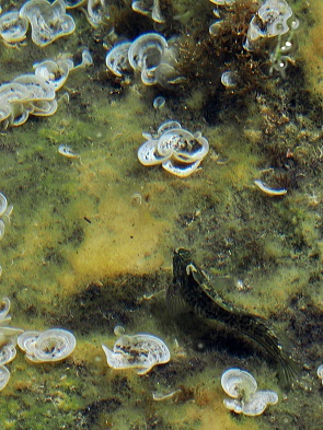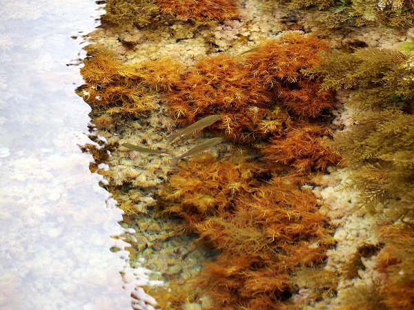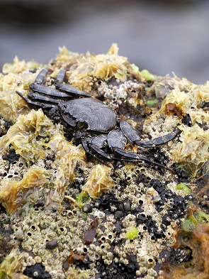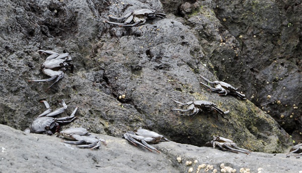 In den kleinen Becken schwimmen scheue klein Fische, die sich bei Annäherung sofort verstecken. Krabben sitzen in verschiedenen Größen und Farben auf den Felsen.