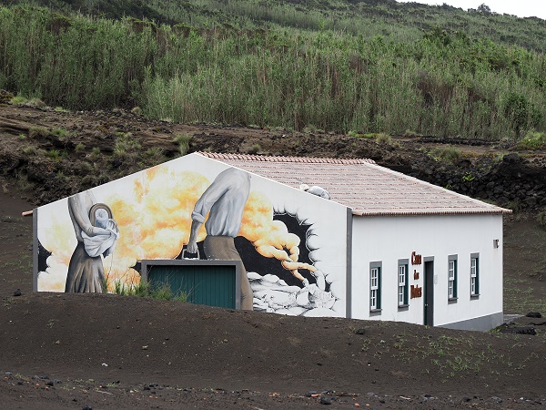 Ein schönes Wandgemälde auf einem Bootsschuppen links in Richtung Hafen hat diese Auswanderung zum Thema. Vor dem Ausbruch befand sich hier einer der wichtigen Fischeranlegeplätze der Region. Die Küste ist von natürlichen Lavaformationen geprägt, die eine Art Basaltplattform ins Meer hinaus bilden, an der kleine Boote festmachen konnten.
