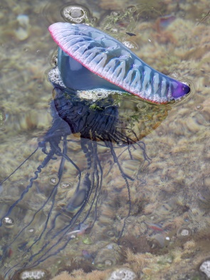 Diese blau-violetten Blasen, vom Wind getrieben auf der Wasseroberfläche, sind recht fotogen. Auf den ersten Blick wirken sie wie eine schimmernde, zartviolette Qualle, doch es ist in Wahrheit eine Kolonie aus spezialisierten Einzelwesen, die zusammen wie ein Organismus agieren. Die langen Tentakel von diesem Staatsquallentier können mit ihren Nesselzellen schmerzhafte, brennende Verletzungen verursachen. Selbst angespült an Land sind die noch gefährlich.