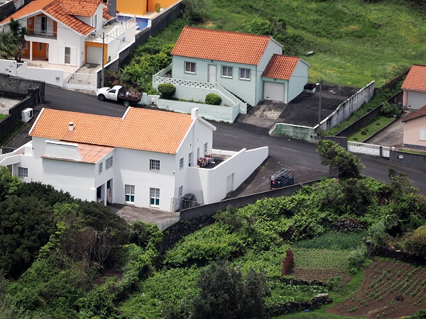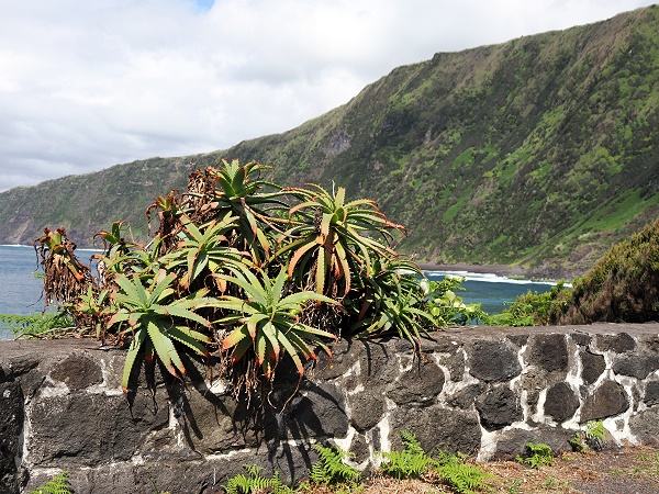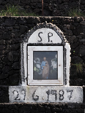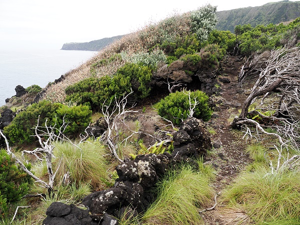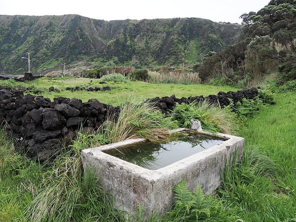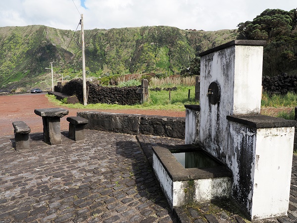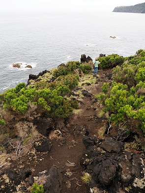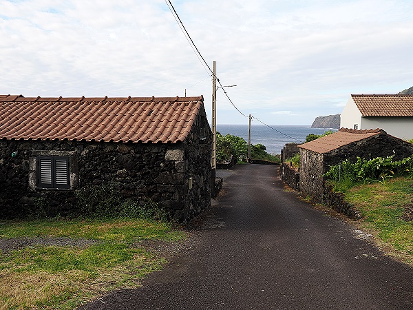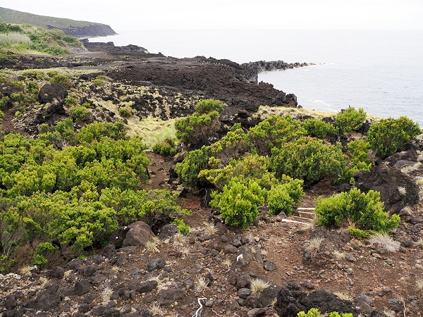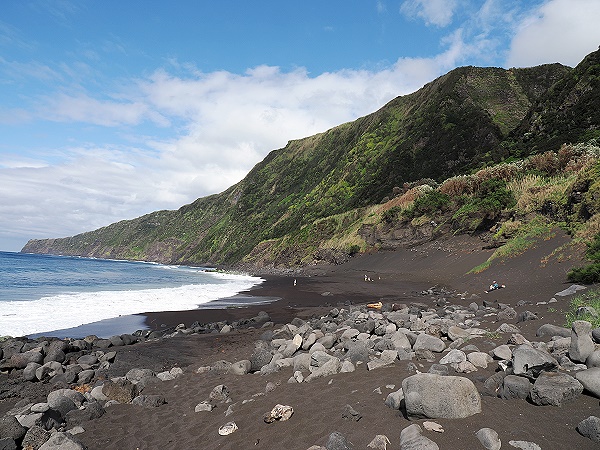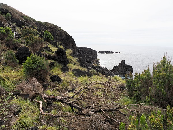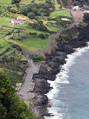 Diese trockene, steil abfallende Küste entstand durch den Lavaausbruch des Vulkans Cabeço do Fogo im Jahr 1672. Damals bildete sich hier unten ein flaches Küstenplateau, eine sogenannte Fajã, die heute heute bewohnt ist und auch landwirtschaftlich genutzt wird. Man wohnt hier am Fuß der Steilküste auf einem bewaldeten Lavafeld.