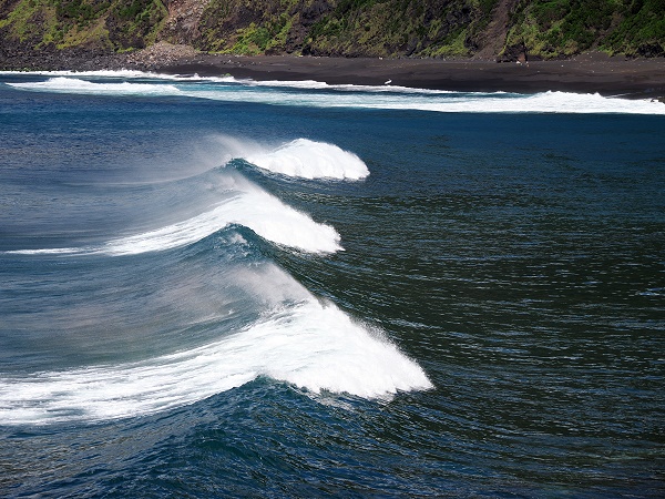 Der schwarzer Lavasand, dazu grobe Basaltsteine und mächtige Wellen prägen hier das Landschaftsbild. Dahinter die steile, begrünte Felswand und weit oben der Miradouro da Ribeira das Cabras mit tollem Ausblick auf diese Szenerie. Eine faszinierende Kulisse aus schwarz, grün und tiefblau. Bilder davon auf der Seite Praia do Norte.