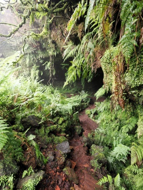 Beobachtet wurden wir von Kühen, die rudum im Nebel standen. Wahrscheinlich latscht man hier einem Bauern über die Wiese, aber sobald man am Eingang zu dem kleinen, grünen Paradies steht ist das vergessen. Betreten auf eigenes Risiko ist jederzeit möglich, es gibt keine feste Öffnungszeit und keine Eintrittsgebühr - und natürlich keine Beleuchtung. Unten im Loch erwarten einen drei Höhleneingänge. Die Treppen sind unregelmäßig und rutschig, die Lavaböden in den Höhlen rauh, hart und kantig und rufen: "Schürfwunde" - also schön vorsichtig sein.