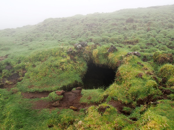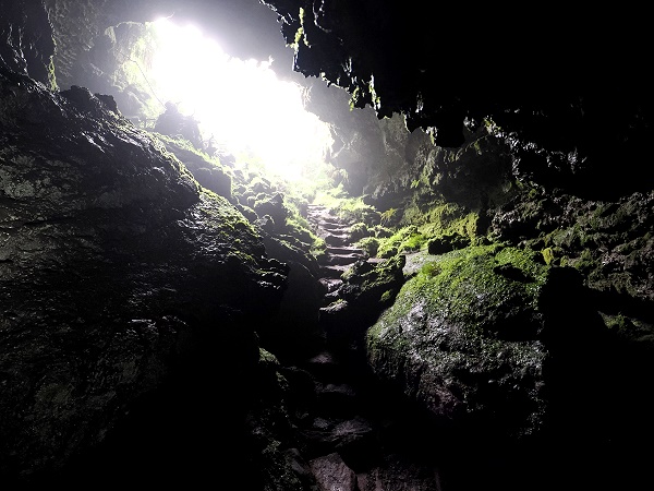 Das Auto parkt man direkt neben der Straße an der Einfahrt zum Acker vor einem Zaun, hier gibt es nur wenige Plätze. Leider hatte es sehr stark geregnet vor unserem Besuch. Der Zugang führt ein Stück über einen Feldweg, dann über ein Viehgatter und dann ohne Beschilderung über eine nasse und matschige Wiese mit riesigen Kuhfladen in Richtung der Lavatunnel. Von der Kuhtränke etwas rechts halten den etwas bewachsenen Hügel hinauf. Dort wachsen Bäume und Büsche auch aus einem natürlichen Einsturzloch, welches mit einem leichten Holzzaun etwas gesichert ist, ein Zugang im Zaun füht zu einer mit Lavasteinen ausgelegten Treppe hinunter ins das Loch von etwa 15 Meter Durchmesser. Da man auch hier nie ganz alleine ist, findet man das auch ohne Führer, wenn man anderen Leuten hinterherläuft, aber kräftiges Schuhwerk, Regenschutz und natürlich auch die Mitnahme einer guten Taschenlampe ist Pflicht, sonst kommt man nicht weit und sieht auch nicht viel.