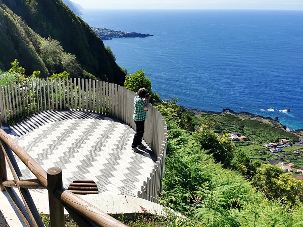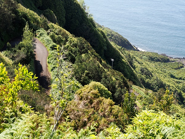 Ab dem Miradouro geht es sehr steil bergab in 8 Kehren hinunter in Richtung Meeresküste. Da alles vollständig neu asphaltiert ist kann man das jetzt auch mit einem normalen Auto bewältigen. Unten angekommen gabelt sich die Straße, hier leiten Hinweistafeln zu den Wanderwegen Caminho do Arco oder Caminho das Quebradas, die zur Küste und zu Aussichtspunkten führen.