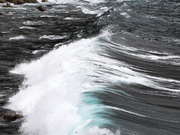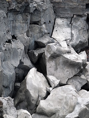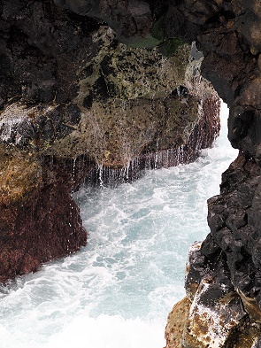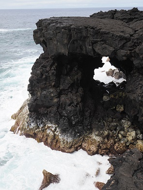 Bei ruhigem Wetter leuchtet das türkisfarbene Wasser besonders intensiv, wir hatten an diesem Tag aber leider wenig Sonne. Dafür donnerten die Wellen um so beeindruckender durch die Engstellen in den Klippen. Mit dem Auto kann man direkt zu einem Parkplatz an den Bogen heran fahren, die Zuwegung in Form einer Schleife ist aber eine Erdstraße. Auf dem Lavafeld davor kann man so einigermaßen laufen, da es über weitere Strecken relativ glatt und eben ist. Spalten und Stolpersteine gibt es auber auch, und an der Kante sollte man wirklich vorsichtig sein, von den Wellen dort will man nicht gegen die Felsen geschleudert werden. Wir sind am Ende dieser Erdtraße noch ein bisschen entlang der Küste gefolgt, wo man schöne Wellen beoabchten kann und es gibt auch noch einen kleineren Bogen an der Küste der Fajã.