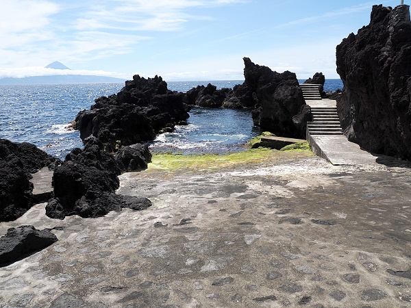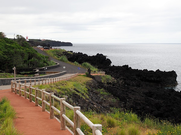 Hinter dem Flughafen führt die Straße hinunter zur Küste. Dort haben wir an der Zona Balnear da Ribeira do Nabo geparkt, einem typischen Azoren-Schwimmbad mit Naturpool zwischen Lavafelsen. Im Sommer ist es sehr belebt, Anfang Juni bei bewölktem Himmel noch fast menschenleer, aber ein schöner Ort für Einheimische und Besucher. Über Treppen gelangt man ans Wasser und kann die Lavafelsen, das kristallklare Meer und sogar einen Felsenbogen, den Miradouro das Arcadas, erkunden. Hier beginnt auch die neue Promenade entlang der Küste, die bis zur Gemeinde Urzelina führt. Wir haben sie von der anderen Seite aus besucht, siehe unten.