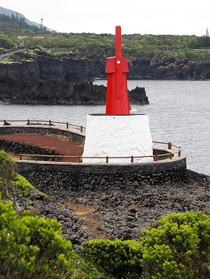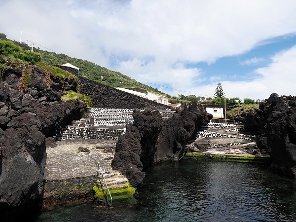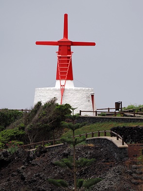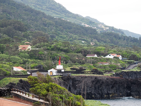 Wir sind mit dem Auto direkt an die Küste gefahren und haben dort geparkt, denn hier gibt es einiges zu sehen. Direkt neben dem Parkplatz stehen mehrere rot gestrichene Windmühlen, die sich dekorativ in die Landschaft einfügen. Sie haben eine andere Form als ihre Verwandten auf der Nachbarinsel Pico. Jede wurde auf einer Plattformen errichtet und sie verleihen dem Ort einen besonderen Reiz.
