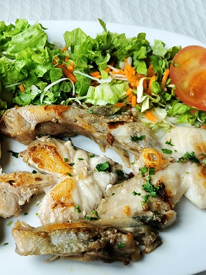 Ich habe mich für Lulas grelhadas, gegrilleten Tintenfisch, entschieden. Michael hatte einen Encharéu (Pseudocaranx dentex). Ein beliebter Speisefisch, ein Makrelenverwandter der typischerweise von der Oberfläche bis in Tiefen um 70 Meter lebt.