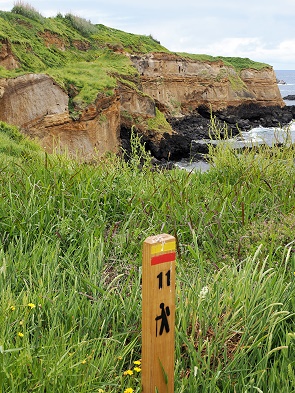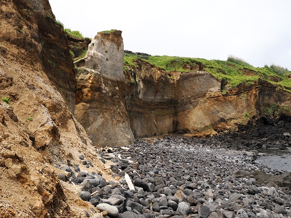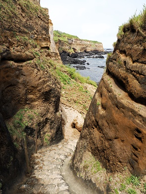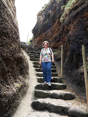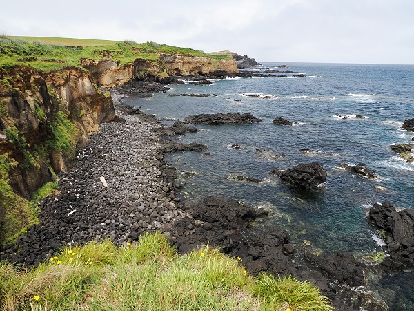 Nur an einer Stelle gab es eine mit Steinstufen befestigte Treppe hinunter zum Strand, aber auch hier kamen wir nicht weiter in dem unwegsamen Gelände. Direkt neben der Treppe hatte es einen Erdrutsch gegeben, normal bei der bröseligen Steilküste. Unten war alles voll mit dicken, rundgeschliffenen Lavasteinen und angeschwemmten Baumstämmen. Hier wären feste Schuhe und auch die von uns so ungeliebten Wanderstöcke von Vorteil.