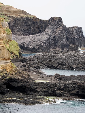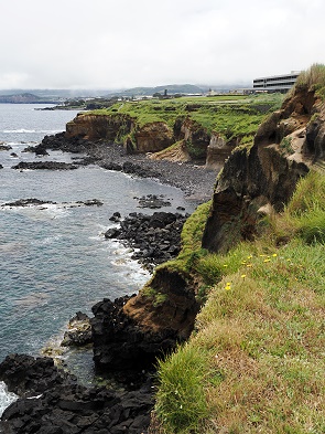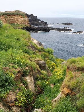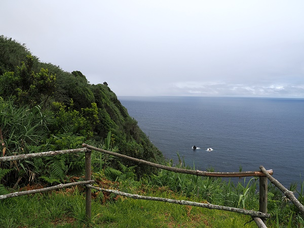 Auf dem Weg von unserer Ferienwohnung Moinho das Feteiras zur Nordküste der Insel São Miguel kamen wir noch einmal an Ponta da Ferraria und Mosteiros vorbei. Am Wegrand liegen hier noch einige Aussichtspunkzte, aber das Wetter war nicht so schön an diesem Tag. Teilweise war die Hauptstraße in Wolken und es nieselte. Ziel an diesem Tag war eine Rundfahrt um den Westteil der Insel, aber das Wetter machte uns einen Strich durch die Rechnung und wir schafften nur einen Spaziergang an der Küste, als dort einmal kurz die Sonne raus kam.