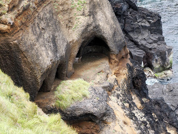 Der am Hotel startetende Pfad führt ein Stück weit entlang der Küste nach Westen und unten am Strand befinden sich einige Höhlen. Genauer gesagt eine Gruppe von Grotten oder Höhlen, die etwa 10 Meter über dem Wasser liegen. Von oben kann man sie ganz gut erkennen, leider fanden wir keinen Weg dort hinunter, dazu war es uns zu steil und das Gestein zu bröselig.