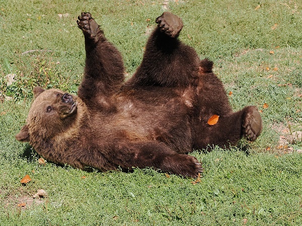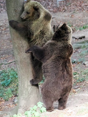 Die beiden Bären zeigten uns das volle Bärenprogramm und wir waren begeistert: Herumrollen auf dem Rücken im Gras, auf einen Baum klettern und wieder hinunterrutschen, den Rücken an der Rinde schubbern, dann ein wenig gemeinsam spazieren gehen und am Ende noch ein kleines Bad. Dazu kam noch die Interaktion mit den Wölfen. Der Rüde lief die ganze Zeit sein Revier ab, während die Fähen müde im Schatten ausruhten. Da sich Bären und Wölfe eigentlich gegenseitig nichts tun können ist das eine gute Kombination, damit die Tiere immer wieder Abwechslung und Animationsprogramm haben.