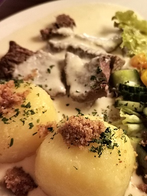 Michael bestellte sich einen Burger, ich hatte sehr leckeren Tafelspitz mit Knödeln. Dazu zwei Gläser Wein und eine nette Bedienung. Die Rechnung betrug dann 56,30 Euro insgesamt und wir waren sehr satt.