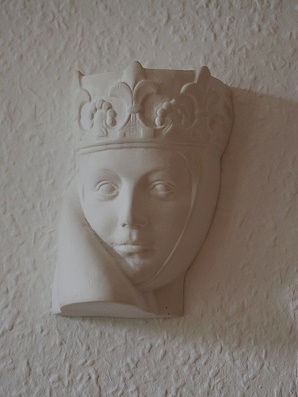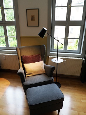 Diese Ferienwohnung besteht aus einem Schlafzimmer und einem großen Wohnzimmer mit Essgruppe, einem Ohrensessel mit Fußteil und einer weiteren Schlafmöglichkeit für eine Person. Schön gestaltet in angenehmen Farben, und an der Wand hängt sogar eine kleine Büste der berühmten Uta. Im Flur kann man in einer beleuchteten Nische Schuhe und Koffer verstauen und Jacken aufhängen.