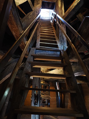 Bei Gegenverkehr wird es eng auf der Treppe, und wenn man oben angekommen ist, brennen die Muskeln. Unterwegs kommt man am mechanischen Uhrwerk und am Glockenstuhl mit dem Dreiergeläut von 1518 vorbei – eine willkommene Unterbrechung beim Aufstieg, um Luft zu holen und ggf. ausweichen zu können. Aber der Aufstieg lohnt sich auf jeden Fall.