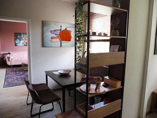 Abgetrennt durch ein offenes Regal schließt sich die Essecke mit Radio an. Für zwei Personen auf der Bank am Fenster ist es etwas eng, daher saßen wir meist gegenüber: einer auf der Bank, der andere auf einem der Stühle davor.