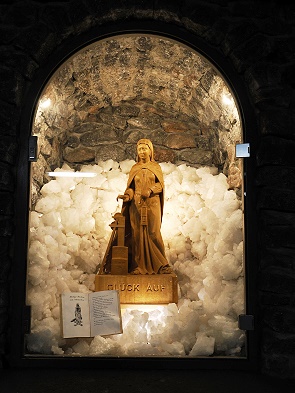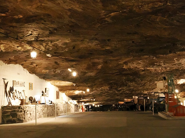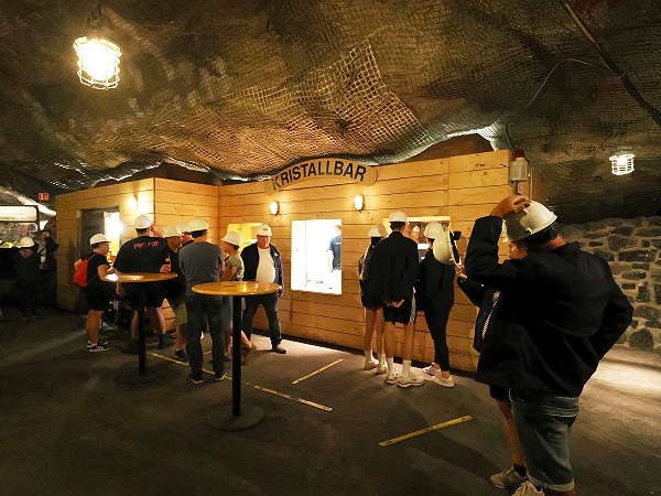 Tief unter Tage an der Kristallgrotte in der Kristallbar gibt es sogar Erfrischungsgetränke, Snacks und Souvenirs zu kaufen und eine Toilette. Hier steht man 800 Meter tief und die Menge wird in kleinere Gruppen aufgeteilt, da nicht alle gleichzeitig in die kleine Grotte passen. Die anderen können dann draußen Getränke bestellen, die darf man auch mitnhemen in die Grotte.