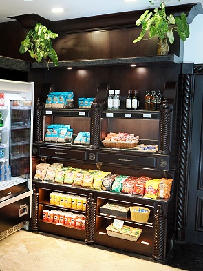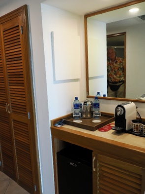 Im Zimmer steht auch ein Tisch mit zwei Stühlen und es gibt einen kleinen Kühlschrank, der sehr leise war. Ebenso hat man hier die Möglichkeit, sich Kaffee mit Kapseln (3 Stück pro Tag werden nachgelegt) oder Tee zuzubereiten. Auch Trinkwaser in kleinen Flaschen wird täglich frisch nachgeliefert.