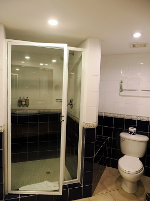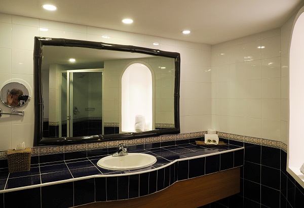 Die meisten Zimmer hier sind einheitliche und sehr großzügig geschnitte Doppelzimmer, es gibt auch einige Suiten und Familienzimmer. Alle haben große Bäder mit einer geräumigen Dusche. Hübsch sind die blauen Kacheln und es gibt viel Ablagefläche. Im Eingangsbereich gibt es einen großen Einbau-Kleiderschränke mit viel Hängemöglichkeiten und dazu im Zimmer eine Kommode mit Schubladen. Isgesamt sind es 60 Quadratmeter.