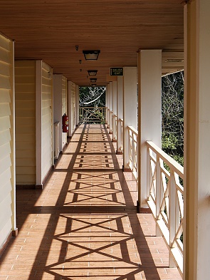 Die Zimmer erreicht man über luftige, offene Flure mit Blick auf grünen Dschungel. Von hier aus kann man schön Vögel beobachten, mehr dazu auf der Seite Vögel im Hotel.