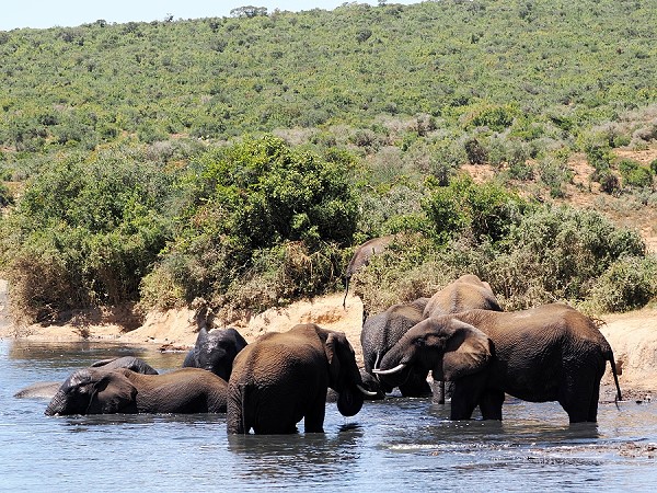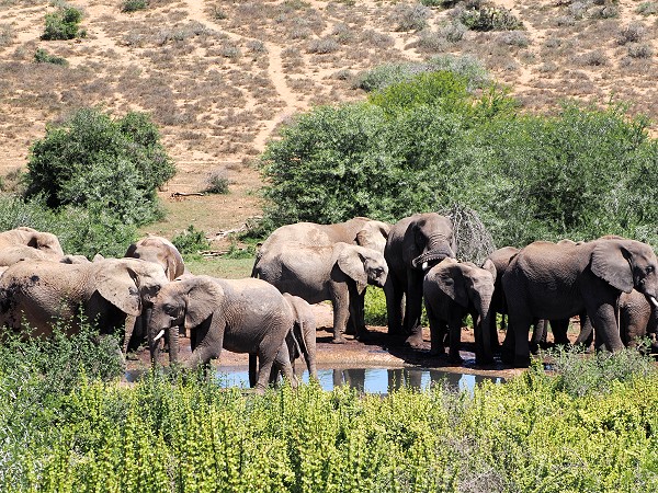 Im Gegensatz zum vorher besuchten Mountain Zebra Nationalpark bei Cradock mit seinen weiten Plateaus ist der Addo stellenweise bergig und dicht bewachsen. Das macht die Tiersuche schwieriger, aber spannender. Addo beherbergt fünf der sieben wichtigsten Vegetationszonen Südafrikas.