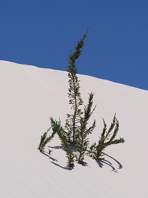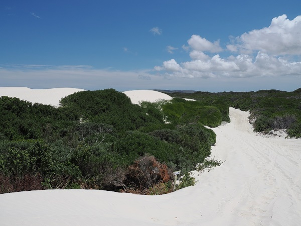 Besonders eindrücklich ist der Strand "Die Plaat". Wir wollten hierher einen kurzen Abstecher machen, kamen aber trotz Allrad nicht ganz bis ans Ende, weil meterhoch feinster Sand auf der Zuwegung Hügel und Dünen bildete. Da niemand sonst hier war, haben wir das Auto am Wegrand stehen gelassen und sind zu Fuß in Richtung Strand gegangen.