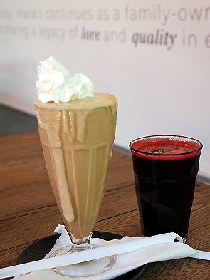 Statt pochierte Eier Benedict mit Lachs auf Rösti wie bestellt brachte die Kellnerin uns leider Rührei mit Lachs auf Croissant. Wir haben es dann trotzdem gegessen, war auch lecker. Dazu tranken wir guten Cappuchino, einen Beetroot-Ginger Saft und ein Glas Kaffee-Milchshake.