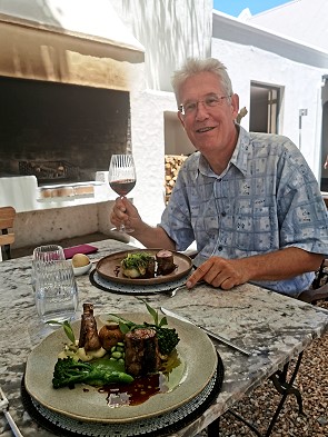 Zur Hauptspeise hatten wir uns für zwei verschiedene Fleischsorten entschieden. Ich hatte dreierlei vom Lamm, darunter einen zarten Lammhals mit Mash und Gemüse. Michael hatte sich für ein ebenfalls hervorragendes Gemsbock-Filet entschieden. Auch hier bekamen wir zwei Weine zur Auswahl. Ich hatte den teuren Grand Provence Red Blend Flagship zum Essen. Ein perfekt ausbalanciertes Beispiel für eine moderne Interpretation eines Bordeaux.