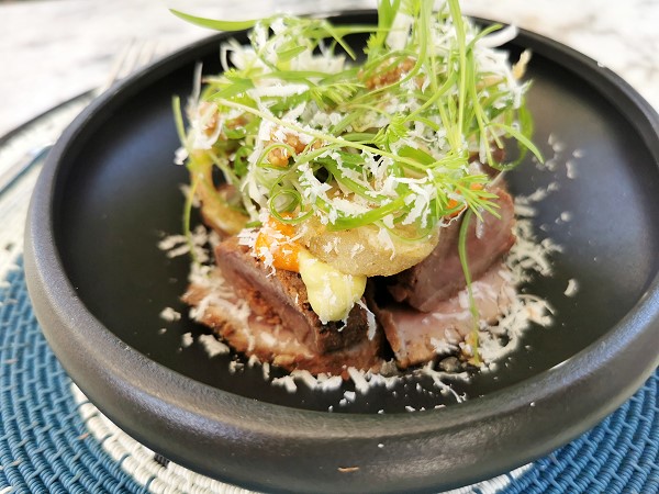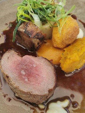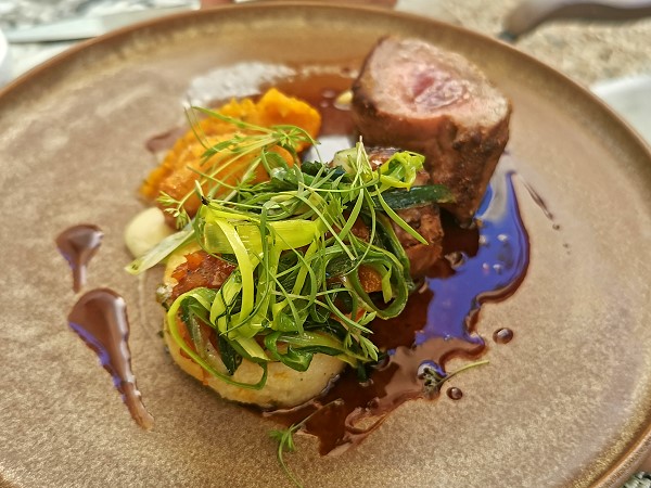 Die Vorspeise bestand aus drei Sorten kaltem Smoked Venison mit feinen Saucentupfen und ansprechend dekoriert. Dazu brachte uns der Kellner sogar zwei Weißweine zur Auswahl und der Knaller war dazu der recht teure Amphora Weiß aus dem Quevri. Dieser kam allerdings nicht wie in Avondale aus Georgien.