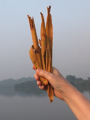 Es ist sehr wahrscheinlich, dass man hier während der Fahrt Bindenwarane sieht, die oft über 1,5 Meter lang werden und ruhig durch das Wasser gleiten. Shyams Vater kleterte an einer Stelle ans schlammige Ufer, um dort frische Zimtrinde zu ernten. Er schabte vom dünnen Stämmchen zuerst die äußere, raue Borke ab. Darunter kommt eine zarte, rötlich-braune Schicht zum Vorschein. Mit Präzision ritzt er die Rinde längs ein und zieht sie dann in hauchdünnen, fast papierartigen Streifen ab. Sie verströmen einen erdigen, warmen Duft: das unverwechselbare Aroma von echtem Ceylon-Zimt.