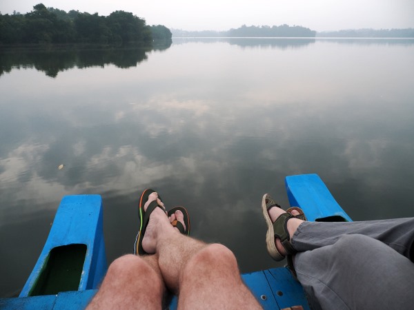 Um halb 6 wurden wir draußen vor dem Bungalow erwartet und man führte uns zum Anleger. Dort hatten Shyams Vater und ein Freund zwei Holzboote zu einem kleinen Katamaran zusammengebunden und auf der Plattform dazwischen stand eine Bank, auf die wir uns bequem setzen konnten. Die schmalen, traditionellen Auslegerboote werden hier Oruwa genannt.