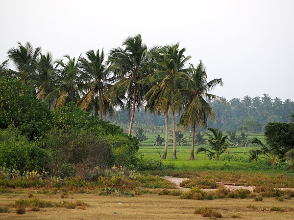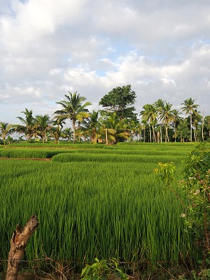 Ein Spaziergang durch das Hinterland der srilankischen Südküste führt uns in eine Welt, in der das tiefe Grün der Reisfelder fließend in das stille Wasser der verzweigten Kanalsysteme übergeht. Bauern arbeiten auf den Feldern, sie kommen meist mit dem Fahrrad oder Motorrad hierher. Während sie auf den schmalen Pfaden zwischen den Parzellen wandern, blieben wir auf dem Hauptweg, der erst ein Stück der Küstenlinie folgt und dann ins Landesinnere schwenkt. Viel Verkehr herrscht hier nicht, da die Straße kaum für Autos geeignet ist, weshalb hier meist nur Motorräder oder Tuk-Tuks unterwegs sind.