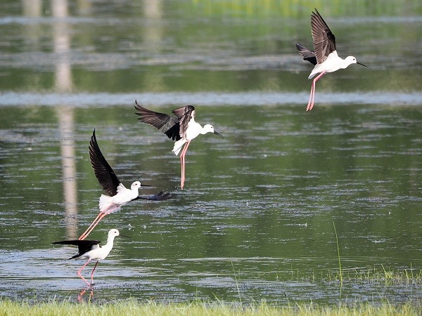 Durch das flache Wasser waten spezialisierte Jäger, die sich durch ihre langen Beine und Schnäbel auszeichnen. Stelzenläufer sind unverkennbar durch ihre extrem langen, dünnen rosa Beine und das kontrastreiche schwarz-weiße Gefieder. Sie stochern im weichen Schlamm nach Kleinstlebewesen, ebenso wie die Löffler.