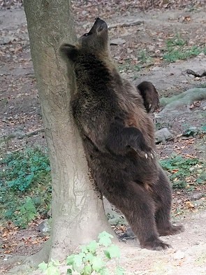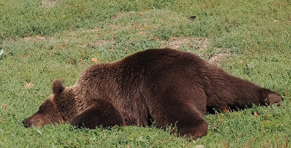 Die beiden Bären zeigten uns das volle Bärenprogramm und wir waren begeistert: Herumrollen auf dem Rücken im Gras, auf einen Baum klettern und wieder hinunterrutschen, den Rücken an der Rinde schubbern, dann ein wenig gemeinsam spazieren gehen und am Ende noch ein kleines Bad. Dazu kam noch die Interaktion mit den Wölfen. Der Rüde lief die ganze Zeit sein Revier ab, während die Fähen müde im Schatten ausruhten. Da sich Bären und Wölfe eigentlich gegenseitig nichts tun können ist das eine gute Kombination, damit die Tiere immer wieder Abwechslung und Animationsprogramm haben.