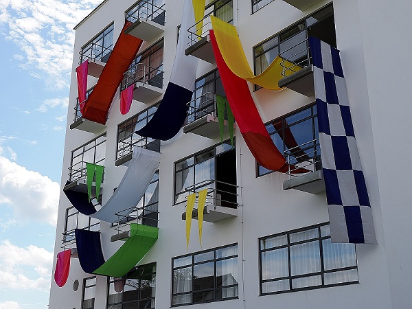 Zentrum von allem ist sicher das Bauhausgebäude in der Gropiusallee 38, es wurde 1925 von Walter Gropius entworfen und 1926 fertiggestellt und verkörpert die Prinzipien des Bauhauses: Funktionalität, Klarheit und Innovation. Mit seiner klaren Linienführung, der Verwendung von Stahl, Glas und Beton sowie dem markanten Schriftzug Bauhaus an der Fassade gilt es als Paradebeispiel für die Architektur der Moderne. Die Balkone waren dekoriert, als wir hier waren. Immerhin war es ein Jubiläumsjahr 2025: 100 Jahre Bauhaus in Dessau. Unter dem Motto "An die Substanz. Bauhaus Dessau 100" finden verschiedene Ausstellungen und Veranstaltungen statt.