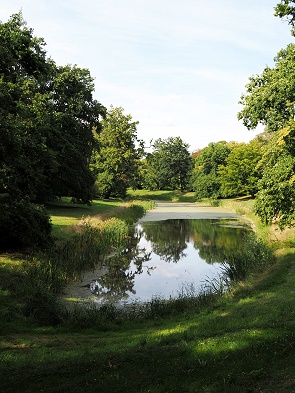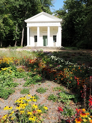 Man spaziert durch sanfte Wiesen, mit Teichen und Obstbäumen und kommt dabei an den typischen klassizistische Kleinarchitekturen wie Tempeln, Statuen, kleinen Brücken, Pavillons und einer Grotte vorbei. Natürlich auch hier mit malerischen Sichtachsen auf Schloss, Fluss und Landschaft.