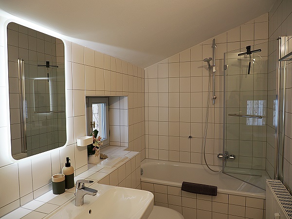 Sehr hübsch fanden wir auch das Badezimmer mit Glasabtrennung zum Duschen über der Badewanne und kostenlosen Pflegeprodukten. Man sollte ein wenig wendig sein zum Duschen. Es gibt Fenster zum Lüften, die in einen Innenhof führen – so ist es uneinsehbar, sehr angenehm.