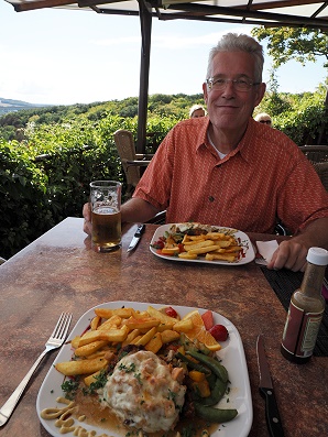 Am zweiten Abend waren wir in Bad Kösen unterwegs und nach einem Rundgang im Ort mit Besuch des Gradierwerks haben wir dann das Abendessen in der Berggaststätte Himmelreich genossen. Am frühen Abend war hier nicht so viel los, am Parkplatz gibt es ein Gehege mit Eichhörnchen. Bei schönstem Wetter konnten wir von der Terrasse aus die beiden Burgen Saaleck und Rudelsburg sehen. Tief unten verläuft eine Schleife der Saale durch viel Grün. Zu einem Radler und einem dunklen Bier genossen wir ein Steak au four, ein Schweinesteak, das mit Würzfleisch bedeckt und mit Käse überbacken ist. Dazu auch etwas Salat und leckere Kartoffelecken. Am Ende zahlten wir 58,50 Euro.