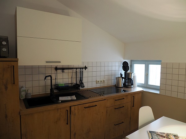 Es gibt eine kleine, voll ausgestattete Küche mit Dachschräge und kleinem Fenster. Ausgestattet mit Kühlschrank, Spülmaschine, Kaffeemaschine und kleiner Sitzecke. Wir haben hier nicht richtig gekocht, sondern sind jeden Abend essen gegangen.
