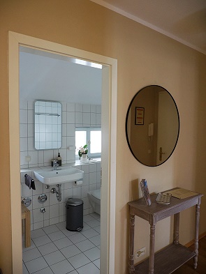 Diese Ferienwohnung besteht aus einem Schlafzimmer und einem großen Wohnzimmer mit Essgruppe, einem Ohrensessel mit Fußteil und einer weiteren Schlafmöglichkeit für eine Person. Schön gestaltet in angenehmen Farben, und an der Wand hängt sogar eine kleine Büste der berühmten Uta. Im Flur kann man in einer beleuchteten Nische Schuhe und Koffer verstauen und Jacken aufhängen.