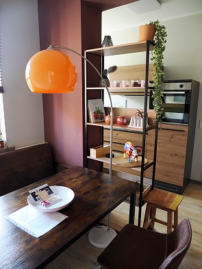 Abgetrennt durch ein offenes Regal schließt sich die Essecke mit Radio an. Für zwei Personen auf der Bank am Fenster ist es etwas eng, daher saßen wir meist gegenüber: einer auf der Bank, der andere auf einem der Stühle davor.