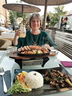 Es gibt hier Cross-Asia, also von Thai, Vietnamesich über Sushi und dazu leckere Cocktails. Mit zwei Cocktails haben wir erst einmal angefangen und den warmen Abend im Freien genossen. Die Speisekarte ist groß, aber nicht überladen. Die von uns probierten Gerichte schmeckten frisch, waren gut gewürzt und lecker. Michael hatte ein Curry, ich die sehr gute Entenpfanne, bei der die Sauce extra serviert wurde. Anstelle einer Nachspeise tranken wir dann noch einen weiteren, anderen Cocktail und zahlten am Ende des Abends 90,00 Euro.
