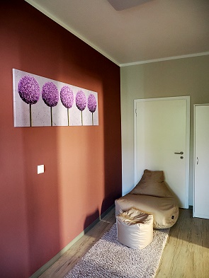 Der Eingang zum Schlafzimmer ist dann um die Ecke am Flurende, daneben steht ein gemütlicher Sitzsack mit Fußteil. In dem in Capuccino-Brauntönen zusammen mit einem warmen Ockergelb gehaltenen Raum steht ein großes Bett, ein Schrank und eine Truhe. Wir haben hier sehr gut geschlafen. Bleibt zu erwähnen, dass dies die erste Ferienwohnung für uns war, in der Handtücher und Bettwäsche für zusätzliche 20 Euro angeboten werden. Die legten wir zusammen mit der Tourismusabgabe für die Stadt Weimar einfach auf den Esstisch.