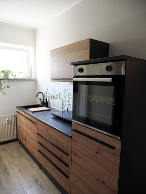 Danach folgt die Küchenecke mit Kühlschrank, zwei separaten Induktionsplatten, Backofen und Geschirrspüler. Geschirr und Utensilien sind reichlich vorhanden. Wir haben dort allerdings kaum gekocht, da wir immer auswärts essen waren.