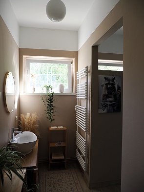 Gleich neben dem Eingang befindet sich die Garderobe, gegenüber das schöne Badezimmer mit Dusche, Waschtisch, Handtuchständer und Handtuchheizung. In warmen Brauntönen und mit kleinen Deko-Elementen wirkt es gemütlich und einladend.