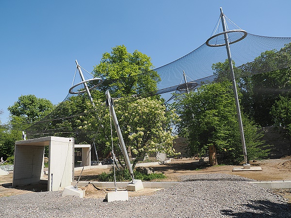 Das moderne Gebäude, das künftig mehreren Menschenaffenarten ein Zuhause bieten wird, trägt den Namen MenschenaffenWald und war bei unserem Besuch noch im Bau. Mit diesem Namen schlägt der Zoo eine Brücke zur Vergangenheit und Zukunft: Einerseits lehnt er sich an den ursprünglich geplanten SchimpansenWald an, dessen Realisierung durch den Brand verhindert wurde. Andererseits berücksichtigt er, dass im neuen Komplex zukünftig nicht nur Schimpansen leben werden, sondern auch Gorillas und Schopf-Mangaben.
