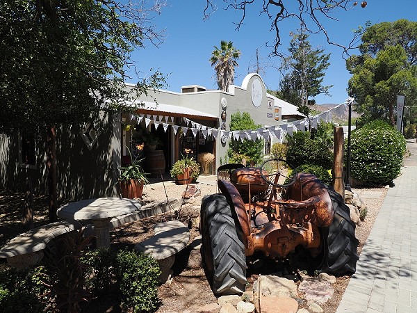 Hier waren wir direkt nach Ankunft im Ort, als wir vom Swartberg Pass kamen, erst mal einen Kaffee trinken. Michael bestellte sich Chicken Majo auf Chiabatta und Chips, ich habe mich für ein Stück Käsekuchen entschieden. Der war sehr lecker, dazu zwei Kaffee und man konnte draussen nett sitzen. Bezahlt haben wir dafür 250 Rand.